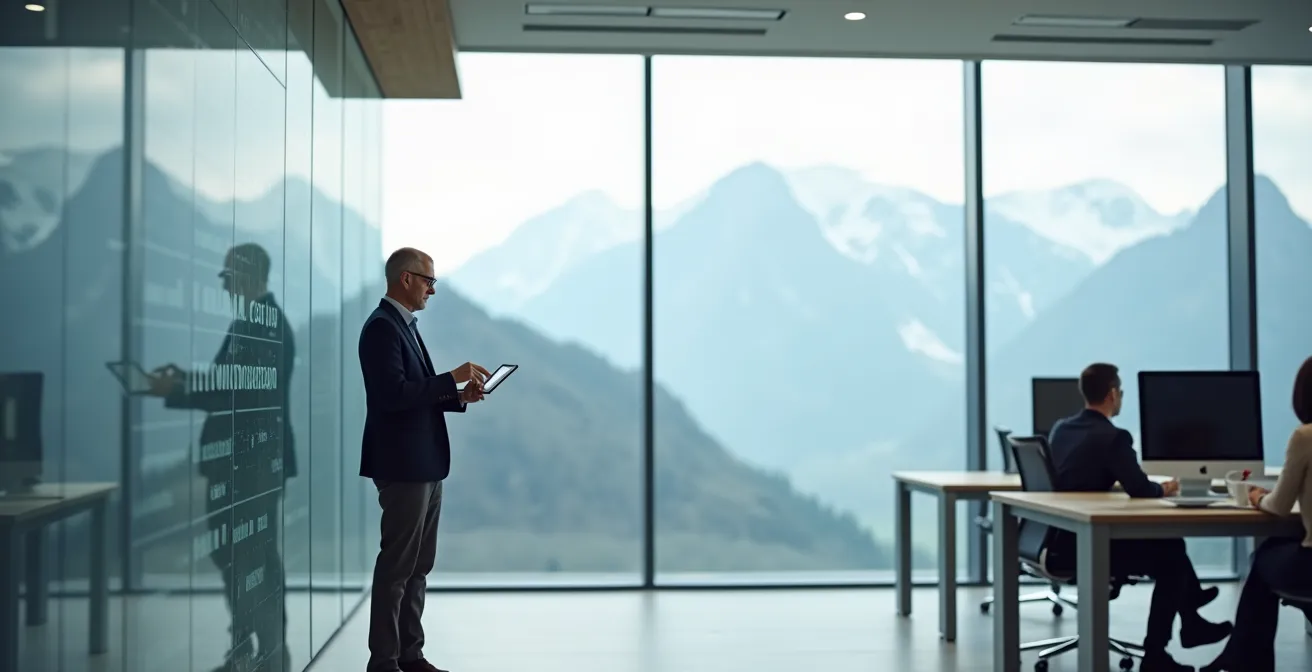 Wie diese Visualisierung eines modernen Schweizer Büros zeigt, geht es um die Schaffung von autonomen, aber vernetzten Einheiten. Die klare Struktur ermöglicht es Teams, fokussiert zu arbeiten, während die Führungskraft den Gesamtüberblick behält und die strategische Richtung vorgibt. Standardisierte Prozesse für Onboarding, Kommunikation und Leistungsmanagement sind das Gerüst, das diesem System Halt gibt. Ohne dieses Gerüst führt jede Neueinstellung zu mehr Komplexität und potenziell zu mehr Chaos, anstatt die Leistungsfähigkeit des Unternehmens zu erhöhen.
